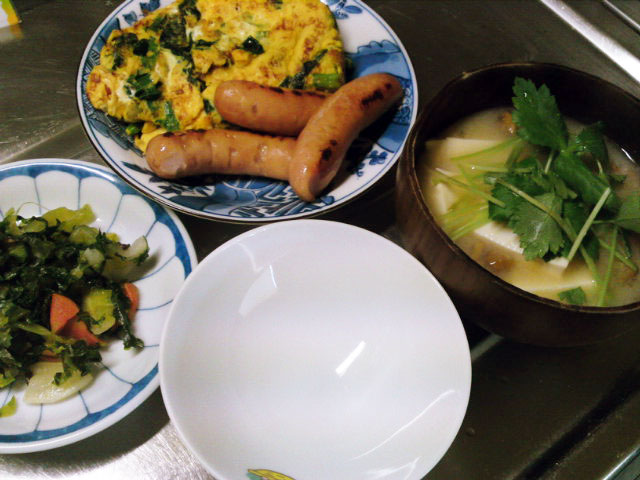 糸三つ葉のおみおつけ、おみ漬け、白いご飯、番茶。以上のメニューでした。