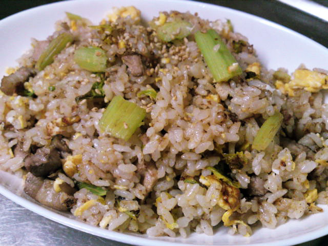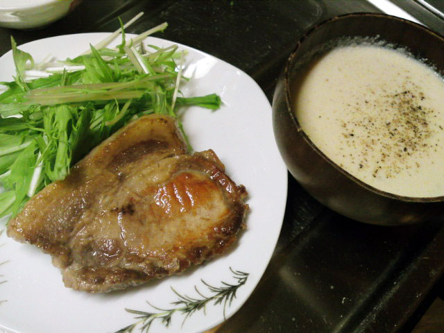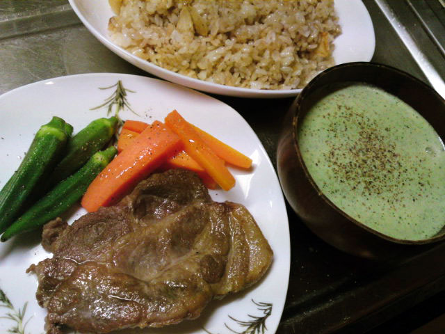 ほうじ茶で煮た豚肩ロース(オクラと人参添)、ガーリックライス、芹・ほうれん草・三葉のポタージュ。ポタージュは、適当に切った野菜に絹豆腐、豆乳を加えハンドミキサーでががっと混ぜて、鍋で温めながら塩コショウで味付けしたもの。メチャクチャ簡単にできますが、なかなか美味しかったです。