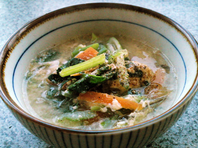具沢山春雨スープ。小松菜や人参、きのこ類などかなり沢山の野菜が入ってます。