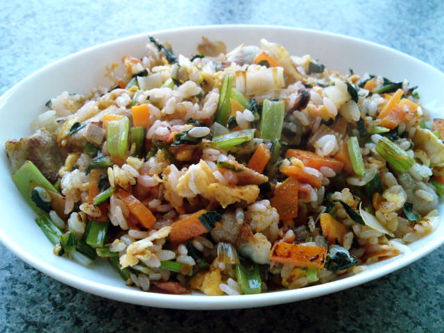 梅肉を入れた爽やかな風味の炒飯。今からの季節に丁度いいですな〜。判りづらいと思いますが、野菜がたっぷり入っているので御飯の量が少なくヘルシーでございます。麦飯で作っても美味しそうだな〜。今度やってみよう!