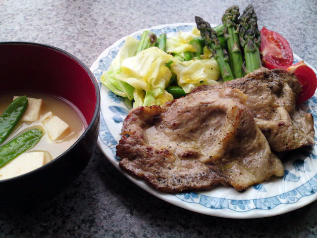 これはおまけで...前に頂いた豚肩ロースの薄切りを炒めただけの簡単ご飯。お味噌汁の具は絹さやとくずしたお豆腐で。豚肉は塩コショウをすり込んで、酒少々で炒めただけですが美味しかったです、ご馳走様でした!