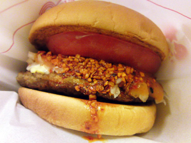 見た目はこんな感じ↑ まあ、そのまんま食べるラー油がハンバーガーに挟まってるという感じですが、ラー油自体はさほど辛くありません、