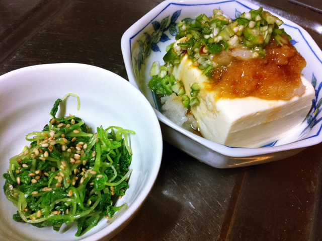 昨日はお肉をがっつり頂いたので、今日は軽めのメニューで。まずは副菜。左がつまみ菜のお浸し、右が叩きオクラと大根おろしをのせた冷奴。お豆腐+大根おろし+オクラは、実家で頻繁に出る夏の鉄板メニュー!お酒のおつまみにも良いですよね(´∀`)