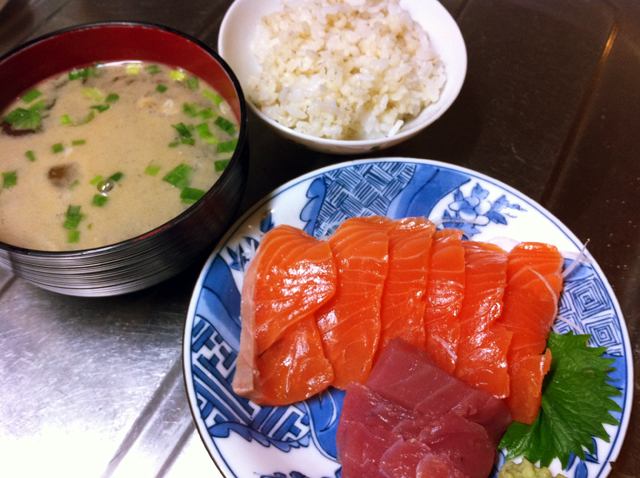 昨日ジンギスカンで、更に昼が出前の鴨南蛮という少し油っけのある食事だったので、夜は魚中心にしてみたんですが、あっさりしてて良いですね〜。うちはあんまり家でお刺身って食べなかったんですが、ジンギスカンに引き続きはまっちゃうかも。夕飯に刺身ばっか食ってる父親の気持ちがちょっと分かった気がしました(これって...年取ったってことじゃないのかしら。。)