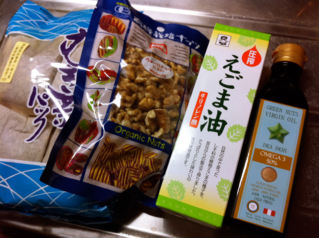 今日買った品々〜、左から国産のむぎ茶パック、クルミ、えごま油、インカグリーンナッツヴァージンオイル。
