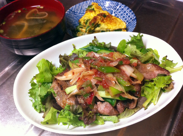 メインは、サーモンとキハダマグロのお刺身。どっちも夕方過ぎて安くなってたものを(それでも覚悟が必要だったけど)買ってきてみました。サーモンはオーストラリア産だったけど、キハダマグロは和歌山県産でした〜。どっちも美味しかったです。キハダマグロが異常に少ないのは、マグロ好きな同居人に多めに盛ってあげたからです!俺優しい!