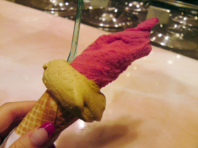 私が注文したのは、ピスタチオと木イチゴ。コクのあるピスタチオと甘酸っぱい木イチゴの組み合わせが最高!色合いも好み!