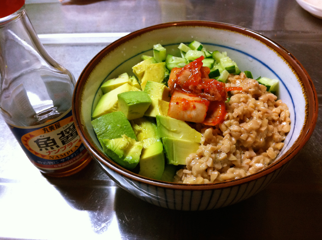アレンジというほどでもないけども、いつものアボカド納豆丼を、少し違った食材で。まあ、オクラがキュウリに変わってキムチが入っただけですが...オクラ高かったんです...(´・ω・`)でも、キュウリでも全然おk!さっぱりと頂けますね!あと、定番の組み合わせだけど、納豆やアボカドにキムチは凄く合います!そこにナンプラーが加わることで、更に美味さが引き立つ!