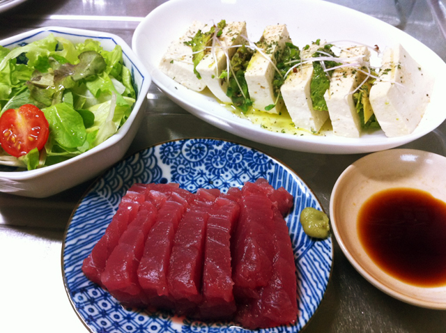 マグロのお刺身と、アボカドと木綿豆腐のカプレーゼ、野菜サラダ、お味噌汁、麦飯。