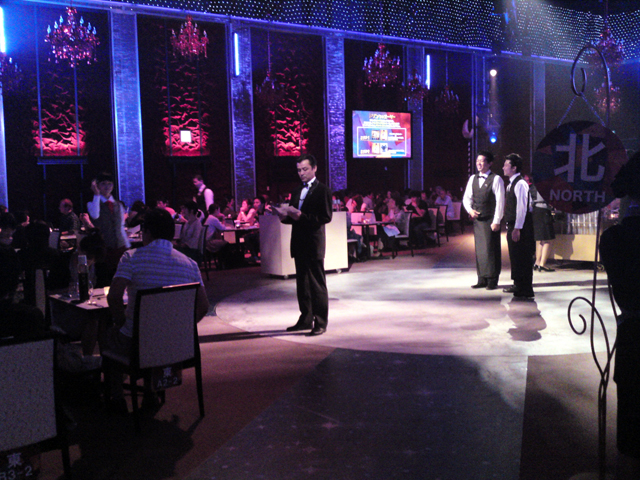 会場に一歩足を踏み入れると、こんな幻想的な空間が広がっておりました(´∀`)ステキー! 赤いシャンデリアと青いライトが何ともいえなくオサレでございました。私たちは女同士で出向きましたが、周りカップルばっか(笑)でも、こんな雰囲気なら恋人連れてきたくなるかもなぁ〜。
