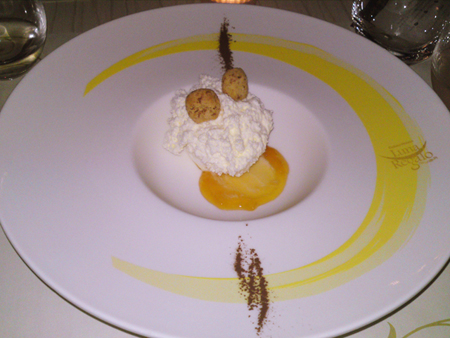 私、甘いものは普段あまり食べないもので、正直デザートにはあまり期待していなかったのです...が!これがっ!めちゃくちゃ美味しかった!ちょっと判りづらいかと思いますが、このデザート、まず一番下にパッションフルーツ・マンゴー・オレンジの三種類のソースを敷き、その上にヨーグルトソルベ、更にそのソルベを覆うようにムースフロマージュブラン(て何?お菓子の知識皆無^^;)が乗っています。食感のアクセントには、ヘーゼルナッツのクッキー。このですね、ムースフロマージュブランがですね...ふわふわとねっとりの中間ぐらいの食感で、とっっっっっても美味しかったんです。甘さも控えめで、これなら甘いもの苦手な人でもパクパクいけちゃいそうですよ!