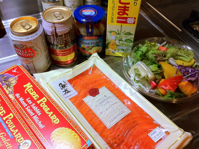 今日買ったもの(at成城石井):えごま油 / ヘングステンベルグ(独)のミックスピクルス / 世界ビール紀行~ドイツメルツェンタイプ~ / ステラ・アルトワ(ベルギー)の缶ビール / メール・プラールのビスケット(母に) / ノルウェー産のスモークサーモン / グリル野菜のバーニャカウダー風サラダ。サラダもサーモンもピクルスも、とにかく美味い。好みの味ばっかり。