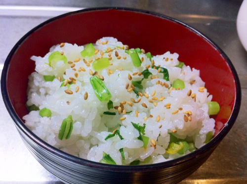 左・盛りつけ図(相変わらず微妙)、右・今日の御飯は菜飯にしてみました。蕪の葉と大根の葉があったので、茹でて塩もみして、炊きたての御飯と混ぜてみた(´∀`)菜飯、美味しいっすよね。白ごま振れば言う事なし!うま!