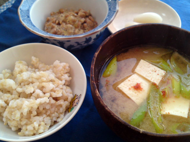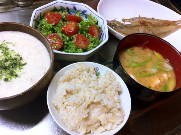 画像は左が今日の夕飯。カレイの干物・とろろ汁・葉わさびとプチトマトのサラダ・ネギと豆腐のおみおつけ、発芽玄米ごはん。今日は昼がみぞれ蕎麦で簡単に済ませたので、夜ご飯は少し張り切って。