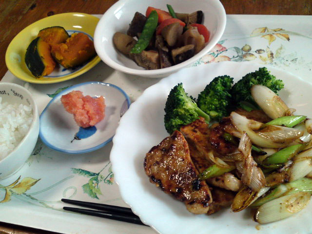 豚肉のねぎみそ焼き、かぼちゃの煮物、野菜と鶏肉の煮物、