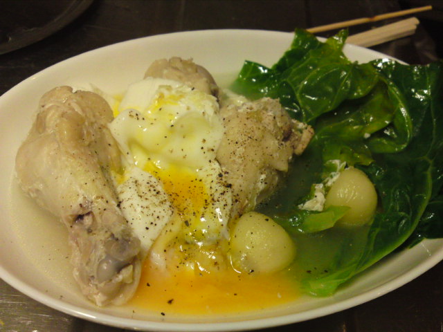 あまりにもメニュー思いつかず、材料もないしで作った鶏手羽元の煮込み。酒で鶏手羽元とにんにくを煮て、塩コショウで味付けして、キャベツの葉で蓋して蒸し煮みたいにしたもの。思ったよりずっと美味しかったので記念にうp。