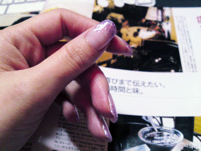 少し短くしてスクエアに整えてもらい、紫のラメグラデーションにしましたぜ。
