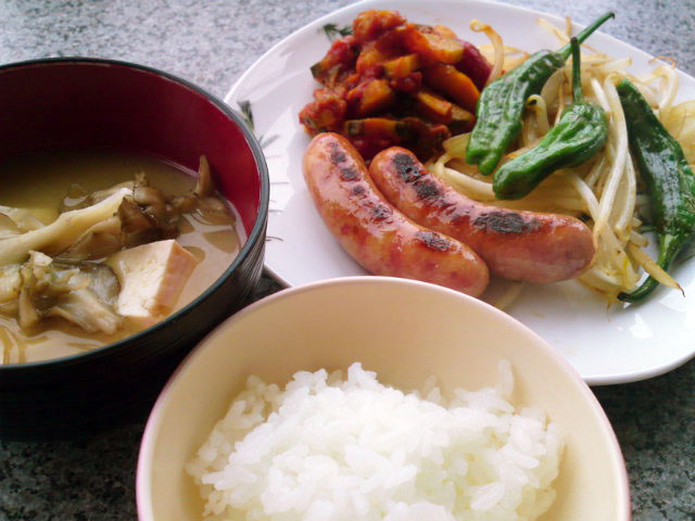 メニューは、即席サバ大根(サバ缶使用)・ニラ玉・ソーセージ野菜炒め、納豆、舞茸と油揚げのおみおつけ、ご飯。食後に緑茶。ちなみにサバ大根はクックパッドのこちら→(