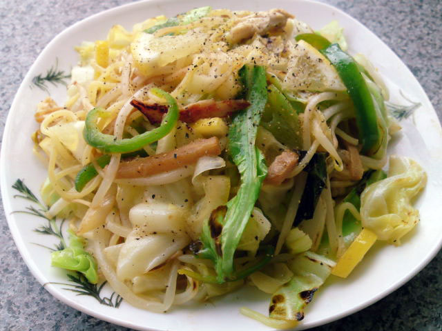 最後は塩レモン焼きそば。具はさいたササミと野菜(もやしキャベツピーマン)、しょうがの千切り、それにレモン。出来上がったら胡椒をたっぷりかけて更にナンプラーを垂らせば、なんとなくタイ風味!さっぱりと美味しくいただけます^ρ^