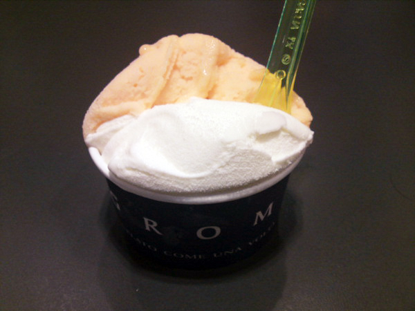GROMで注文した、ヨーグルトのジェラートとメロンのソルベです(´∀`)メロンが予想以上に美味しくて、まるで果肉を食べているような濃厚さ!