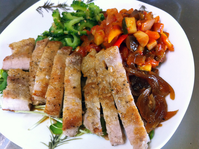 (昼)ポークソテー、ラタトゥイユ、塩もみゴーヤ(+つまみなのサラダ、味噌汁、麦飯) ラタトゥイユがとっても美味しくできた!ゴーヤはもう少し苦味を抜いたほうが良かったな...ちょっと失敗;まあでも、夏バテ対策にはなかなか効果的なメニューにできた◎